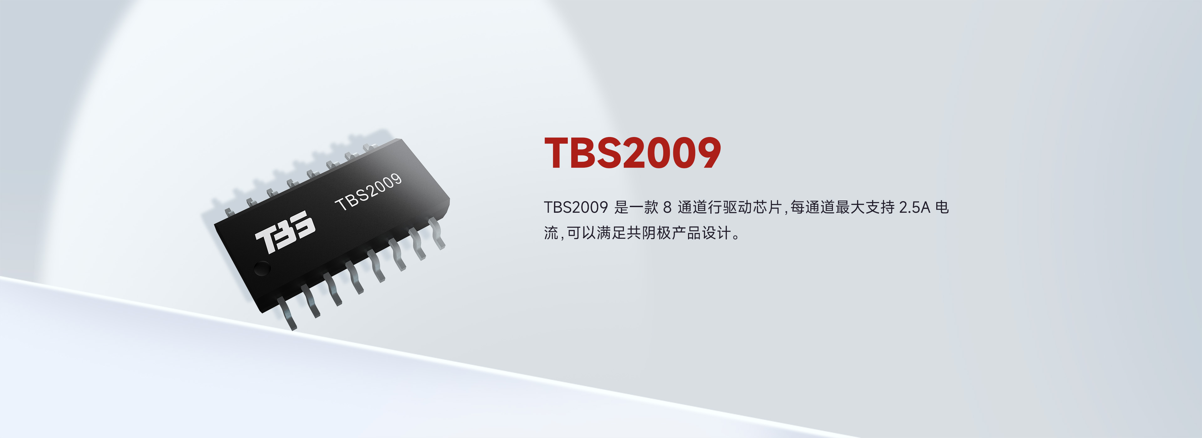 相关推荐: PCB基解决方案 玻璃基解决方案 行驱动芯片 产品型号 LED类型 驱动架构 输出通道数 位深 电流范围 封装类型 点检 行管集成 更多 TBS5367 共阴 PAM+PWM 48 24bit 0.1~10mA QFN88 Yes Yes TBS5267A 共阴 PAM+PWM 16 16bit 0.2~20mA SSOP24/QFN24 Yes No TBS5266A 共阳 PAM+PWM 16 16bit 0.2~20mA SSOP24/QFN24 Yes No TBS3266A 共阳 PAM+PWM 16 16bit 0.2~20mA SSOP24 Yes No 产品型号 LED类型 驱动架构 输出通道 位深 Data Range 接口 速率 行管集成 更多 TBS5662 共阴 两段Duty 480Chs 12bit 0.2~7.3V Typ P2P 0.6Gbps~2Gbps 52Chs 产品型号 LED类型 输出通道数 最大电流 封装类型 耦合抑制 上鬼影消除 更多 TBS2008 共阳 8 2.5A SOP16/QFN16 Yes Yes TBS3008 共阳 16 2A SSOP24 Yes Yes TBS3009 共阴 16 1.7A SSOP24/QFN24 Yes Yes
